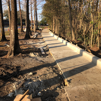 The project started with removing the existing sidewalk and digging a trench from the edge of the woods to the opening of the stormwater drain. A 12-inch-high wall was then formed along the woods to hold back any high-level water and channel it into the trench. All that heavy equipment broke our irrigation lines in several places but al least Orange County installed new sod to cover the entire affected area and the irrigation lines were repaired quickly by our landscaper.