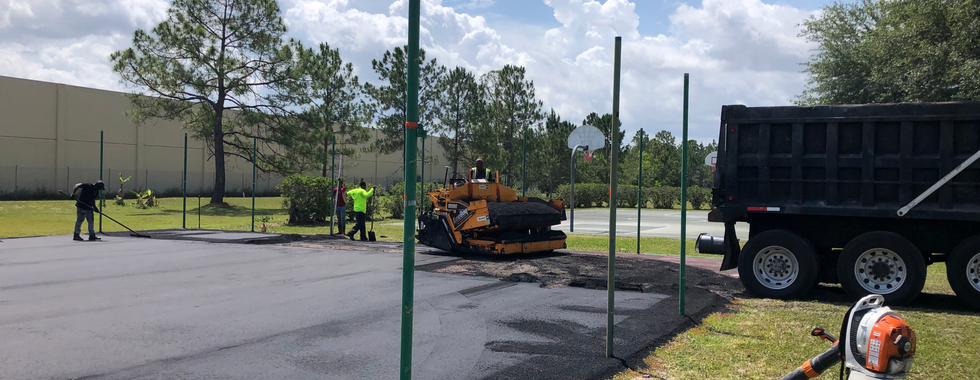 1.5 inches of heated asphalt were applied to the surface of the court, then rolled flat and smooth to one inch thick by the rolling machine. This new surface requires 30 days to cure before the next process can begin. It's important for everyone to stay off the surface while the court is under repair.